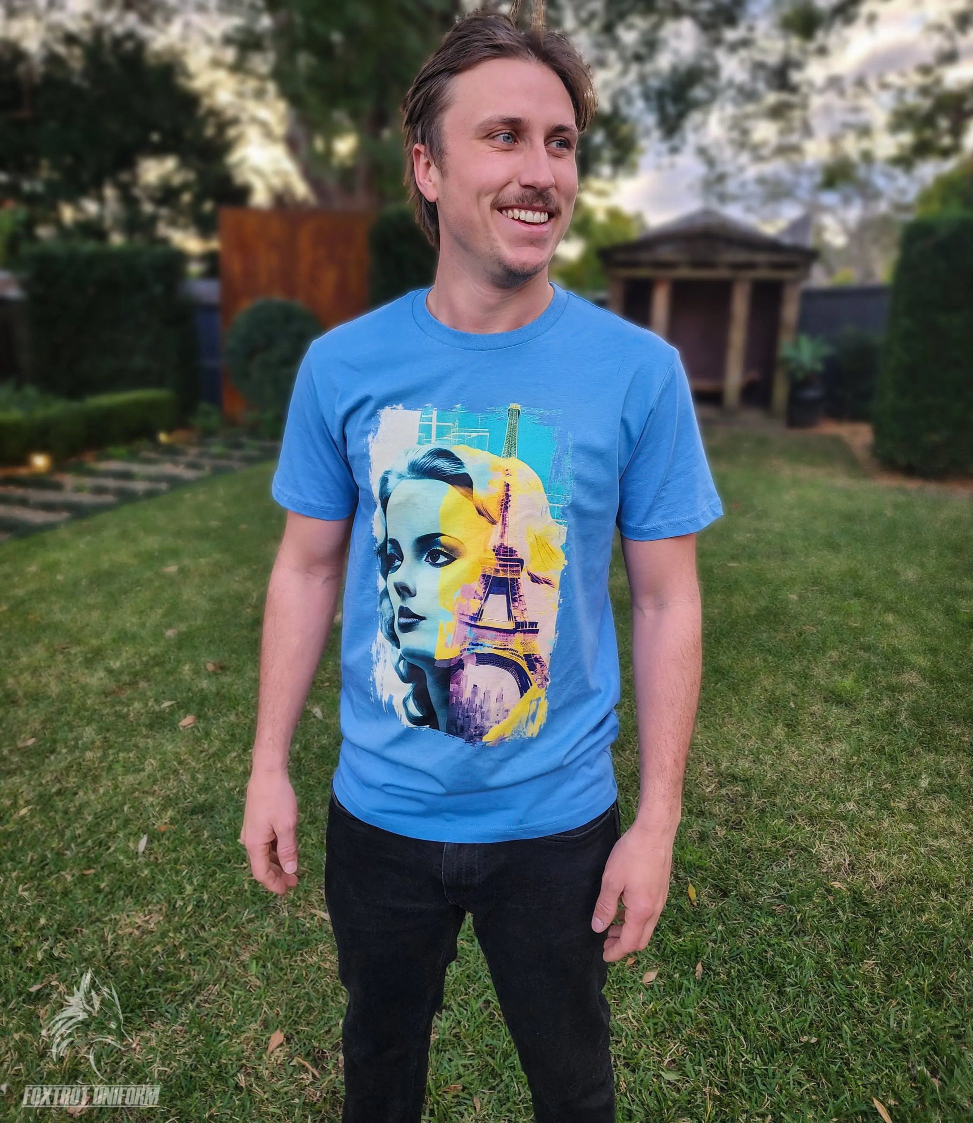 Bonjour, fashion aficionados! Prepare to be swept off your feet by this enchanting tee, a heartwarming double exposure that captures the essence of romance and the allure of Paris. This mesmerizing artwork brings together a lovely mademoiselle and the iconic Eiffel Tower in a union that's as magical as it is stylish. The blue and yellow hues evoke the timeless charm of the City of Lights, ensuring you'll always have a pièce de résistance in your wardrobe. So, say oui to this fashion masterpiece and let your style shine like a beacon in the night – after all, who could résist the allure of this stunning homage to l'amour?