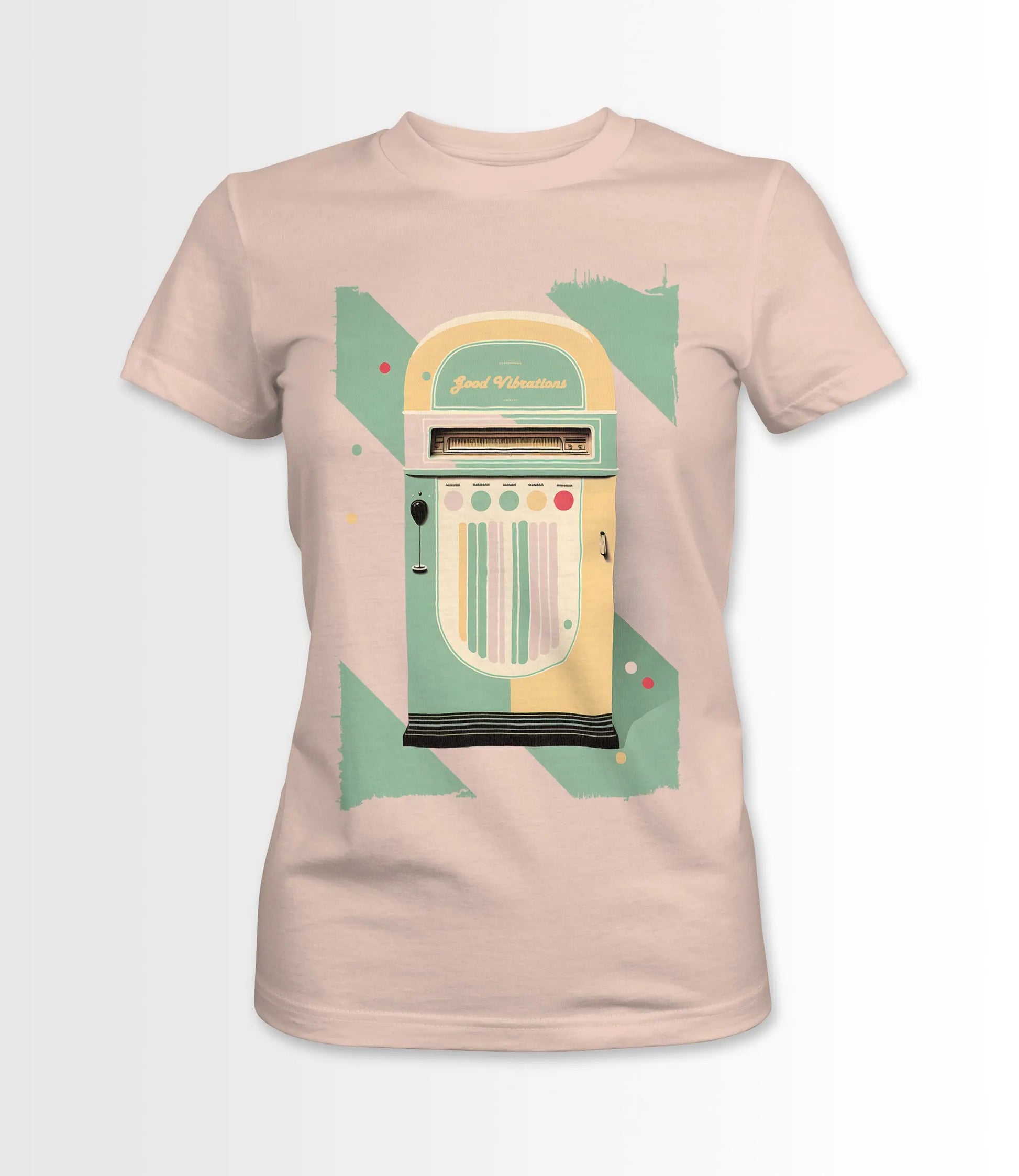Get ready to groove to the sweet tunes of yesteryear with this tee, a delightful blend of vintage charm and modern flair. Featuring a minimalist design of a classic 50's jukebox, this shirt transports you back to an era of sock hops and root beer floats, all wrapped up in a pastel-hued package. Inspired by the nostalgic atmosphere of a 50's malt shop, this wearable art piece is your ticket to a time when poodle skirts twirled and good vibes filled the air.